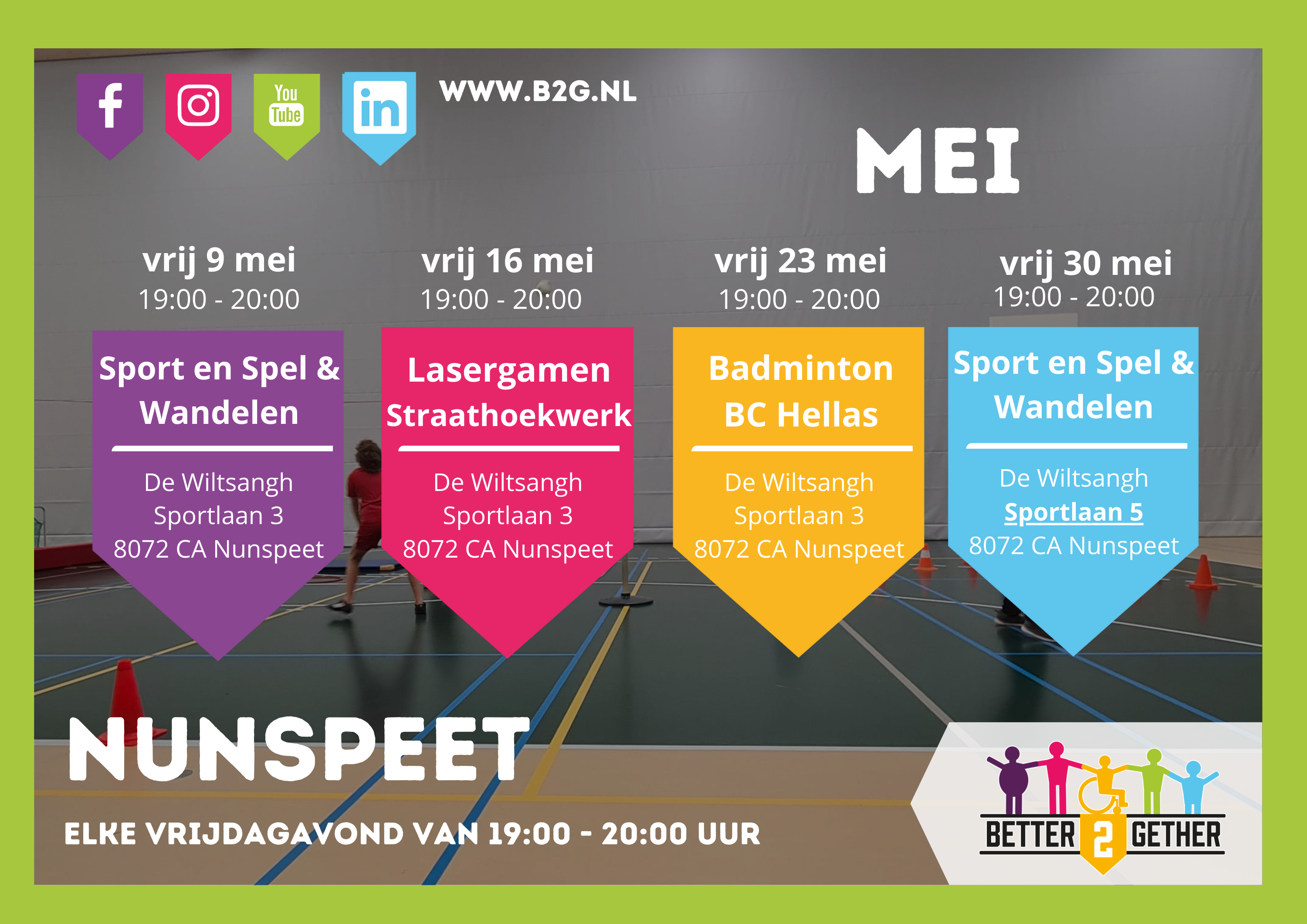 Inclusief sporten voor iedereen uit de gemeenten Elburg, Nunspeet, Oldebroek of daarbuiten; het kan bij Better2Gether. Bij ons maakt het niet uit of je een beperking hebt of juist niet, want aan de sport- en beweegactiviteiten die we aanbieden kan iedereen meedoen. Daar zorgen we wel voor. Vaak ook in samenwerking met lokale sportaanbieders. Het aanbod is dus erg gevarieerd, er is genoeg fanatisme, maar wij streven vooral naar de lach op het gezicht!
