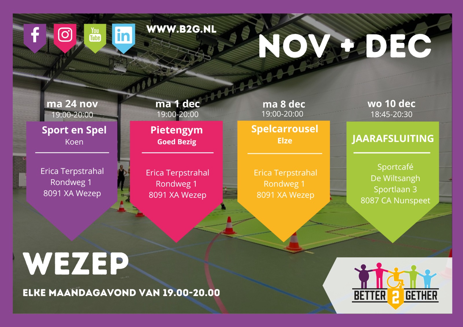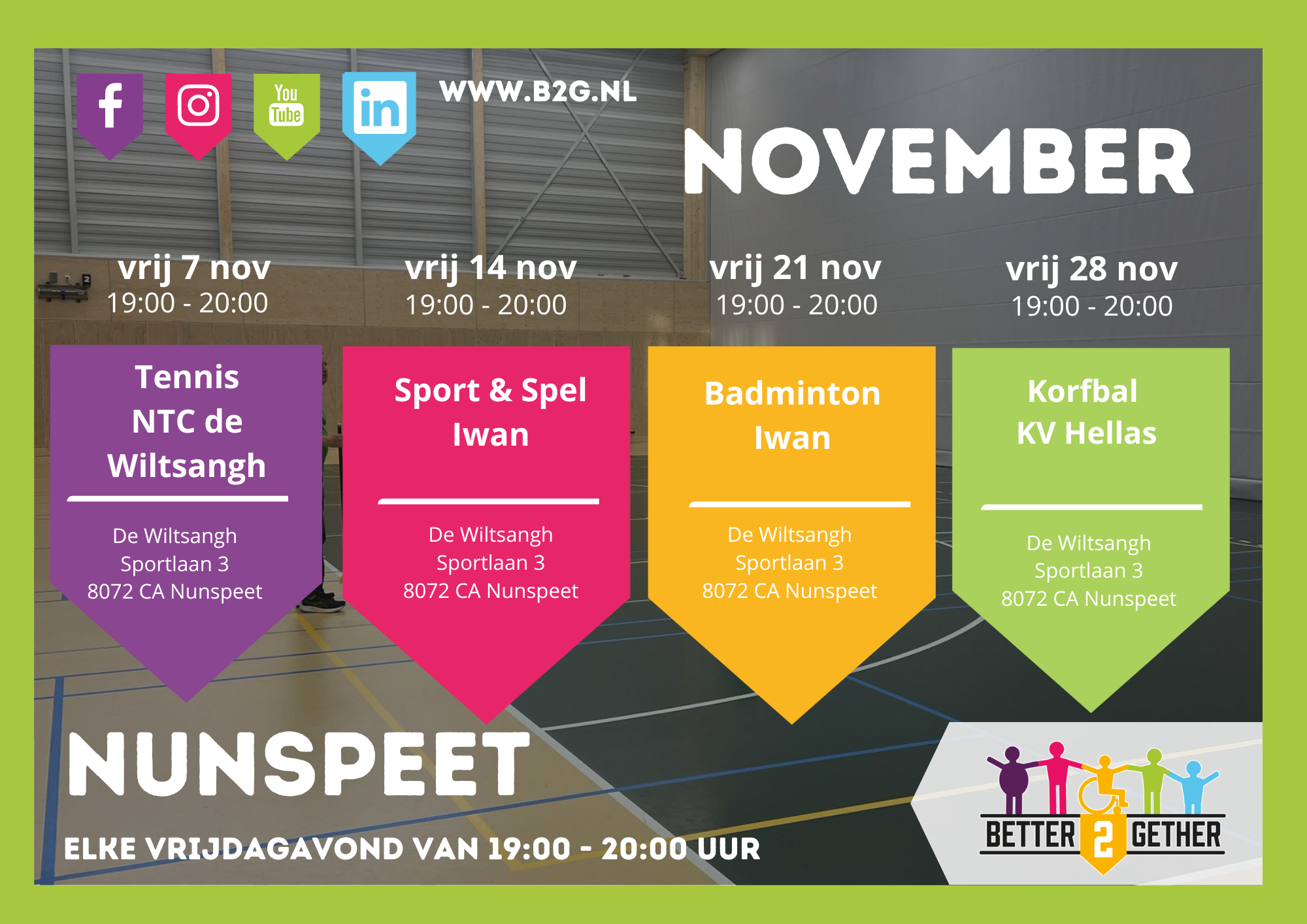 Inclusief sporten voor iedereen uit de gemeenten Elburg, Nunspeet, Oldebroek of daarbuiten; het kan bij Better2Gether. Bij ons maakt het niet uit of je een beperking hebt of juist niet, want aan de sport- en beweegactiviteiten die we aanbieden kan iedereen meedoen. Daar zorgen we wel voor. Vaak ook in samenwerking met lokale sportaanbieders. Het aanbod is dus erg gevarieerd, er is genoeg fanatisme, maar wij streven vooral naar de lach op het gezicht!