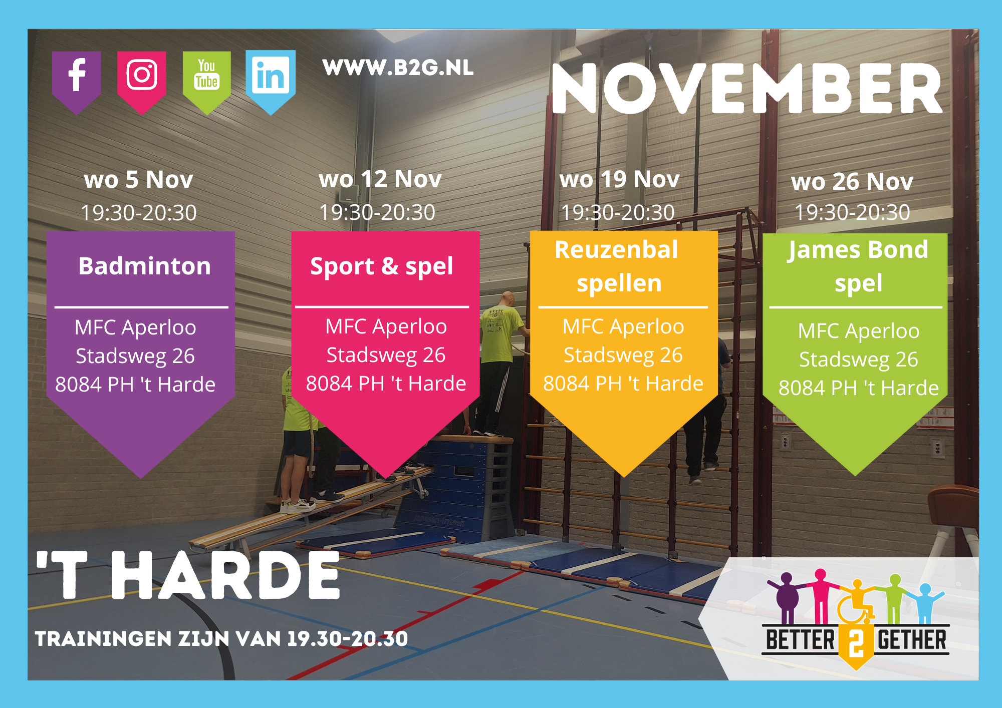 Lijkt het jou ook leuk om mee te gaan sporten? Kom dan snel een keer kijken in Elburg/’t Harde, Nunspeet of Wezep. Hopelijk tot snel!